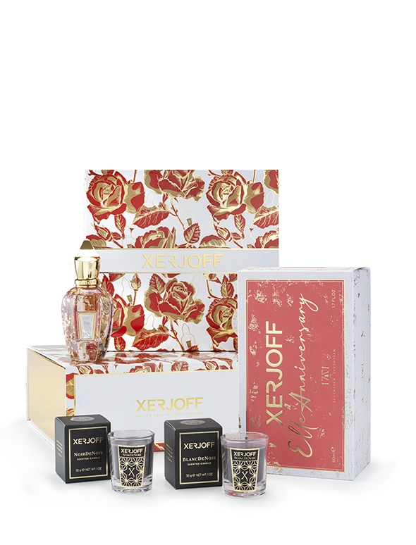 Created as a tribute to the very first Xerjoff perfume, Elle Anniversary maintains the floral charm and sophistication of the original Elle fragrance, while caressing the wearer with a sweet, youthful touch. A sprinkling of red fruits and green apple amongst the bergamot and lychee top notes make for a pleasingly fresh opening. Jasmine is accompanied and warmed by cashmere wood at the heart before the perfume settles into its assuaging base. Included in the Elle Anniversary Gift Set are two scented candles from the Scentimento collection, BlancDeNoir and NoirDeNoir. With their gentle aromas and soft glow, they are perfect for setting a romantic tone.